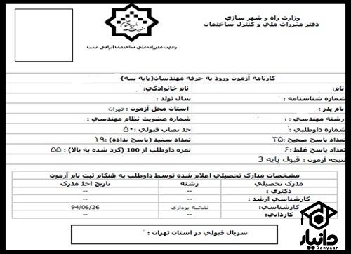 بعد از انتخاب سامانه آزمون های ورود به حرفه، در زمان اعلام جواب لینکی با عنوان "نتایج ورود به حرفه مهندسان ۱۴۰۴" فعال شده که لازم است داوطلبان بعد از انتخاب آن با توجه به روش های پیشنهادی و اطلاعات در دسترس نسبت به مشاهده نتیجه آزمون اقدام نمایند. حتما پیشنهاد می گردد در صورت قبولی پرینت نتیجه آزمون را پرینت کرده و در صورت لزوم برای تشکیل پرونده به سازمان نظام مهندسی ساختمان استان ها ارائه شود. نمونه کارنامه قبولی داوطلب مطابق شکل زیر می باشد: