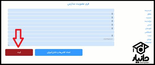 مخاطب سپس به صفحه بعد رفته و در این مرحله نیاز به این داشته تا فرم عوضیت مدارس را تکمیل نماید. بر همین اساس اطلاعاتی نظیر نام مدرسه، مقطع، جنسیت و موارد دیگر را درج کرده و بر روی گزینه ثبت ضربه می زند.
