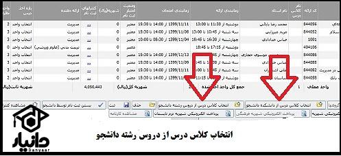 با ورود به بخش انتخاب واحد، ابتدا اطلاعات دروس دانشجو نمایش داده می شود. در گام بعدی دانشجو باید از قسمت انتخاب کلاس درس از دروس دانشجو یا انتخاب کلاس درس از دانشکده دانشجو، لیست "درس های ارائه شده در ترم تحصیلی خود" را انتخاب کند.