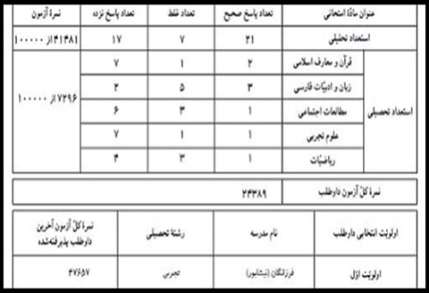در نمونه ای که در تصویر زیر مشاهده می شود، یک کارنامه پایش مربوط به پایه نهم قرار دارد. در کارنامه پایه نهم می توان بخش های اضافی مربوط به استعداد تحصیلی و استعداد تحلیلی را هم مشاهده کرد که برای این پایه ضروری هستند. کارنامه داوطلبانی که از پایه ششم قصد ورود به مدارس تیزهوشان را داشته باشند این دو بخش را شامل نخواهد شد.