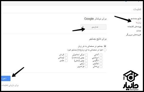 در ادامه باید وارد بخش زبان ها شده و زبان فارسی را مورد گزینش قرار داد. لازم به ذکر است که اگر گوگل افراد از پیش فارسی شده باشد، نیاز به طی کردن این مراحل نخواهد بود.